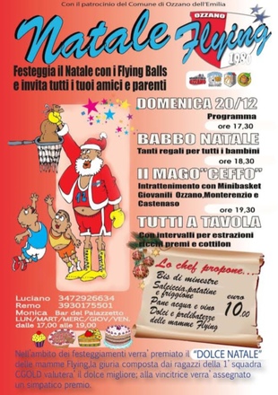 "Natale Flying!" Festa della società di basket Flying balls: Babbo Natale arriverà con tanti regali per tutti i bambini e sarà in compagnia del Mago Ceffo. Intrattenimento di minibasket delle giovanili di Ozzano, Monterenzio e Castenaso e per finire...tutti a tavola!