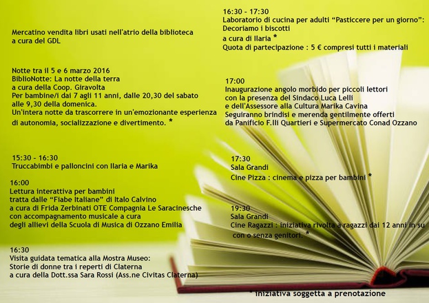 Mercatino libri usati, truccabimbi e palloncini, lettura interattiva, visita guidata alla Mostra museo di Claterna, laboratorio di cucina per adulti, inaugurazione “Angolo morbido”, Cine pizza e Cine Ragazzi